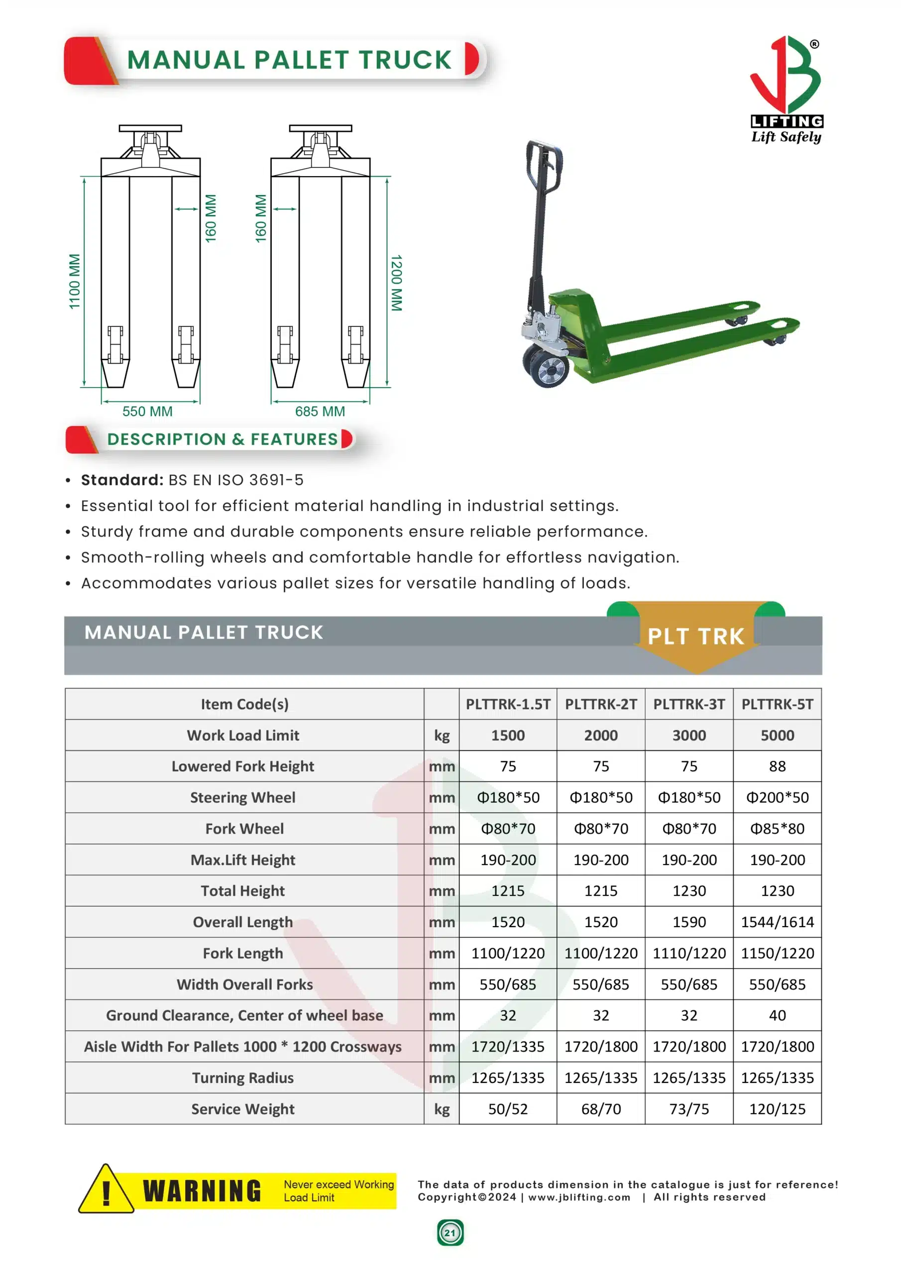 Below is the Manual Pallet Truck Data Table, providing detailed technical specifications for various models.
